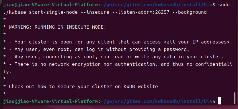 ./kwbase start-single-node --insecure --listen-addr=:26257 --background