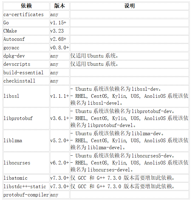 KWDB 支持在 Linux 操作系统进行安装部署,下表列出了编译和运行 KWDB 所需的软件依赖。
