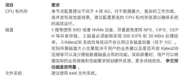 下表列出部署 KaiwuDB 所需的硬件规格。