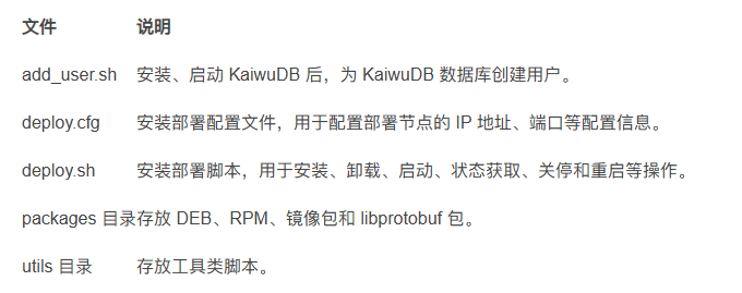 安装时,KaiwuDB 会对依赖进行检查。如果缺少依赖会退出安装并提示依赖缺失。如果目标机器不能联网,用户需要在能联网的机器上根据目标机器的操作系统下载好所有依赖文件,然后将依赖文件复制到目标机器上进行安装。