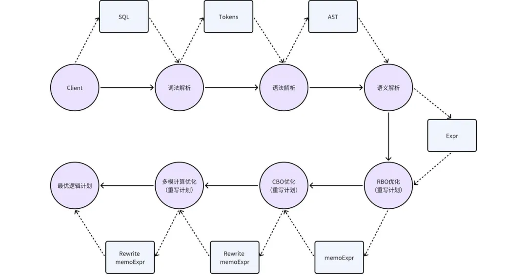 在 KWDB 的编译阶段,SQL 语句主要经历词法解析、语法解析和语义解析三个处理步骤。其中,为进一步优化执行计划,在语义解析阶段还会同步进行 RBO 优化。