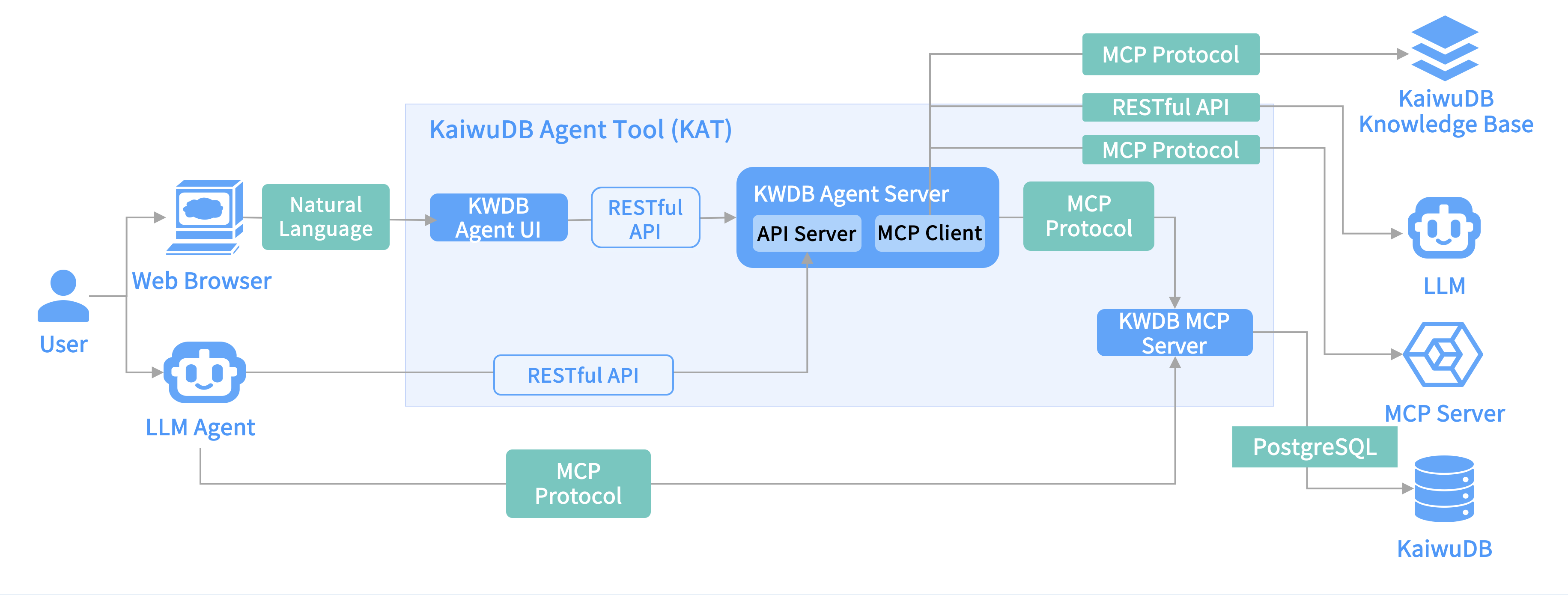 KAT (KaiwuDB Agent Tools ) 是基于 MCP (Model Context Protocol)协议构建的数据库智能体工具。KAT 将自然语言处理技术与 KaiwuDB 数据库的强大能力深度融合,用户通过简单的对话即可完成 KaiwuDB 安装部署、数据分析、未来预测等高级查询任务,获得直观易懂的结果,大幅降低数据库开发门槛。
